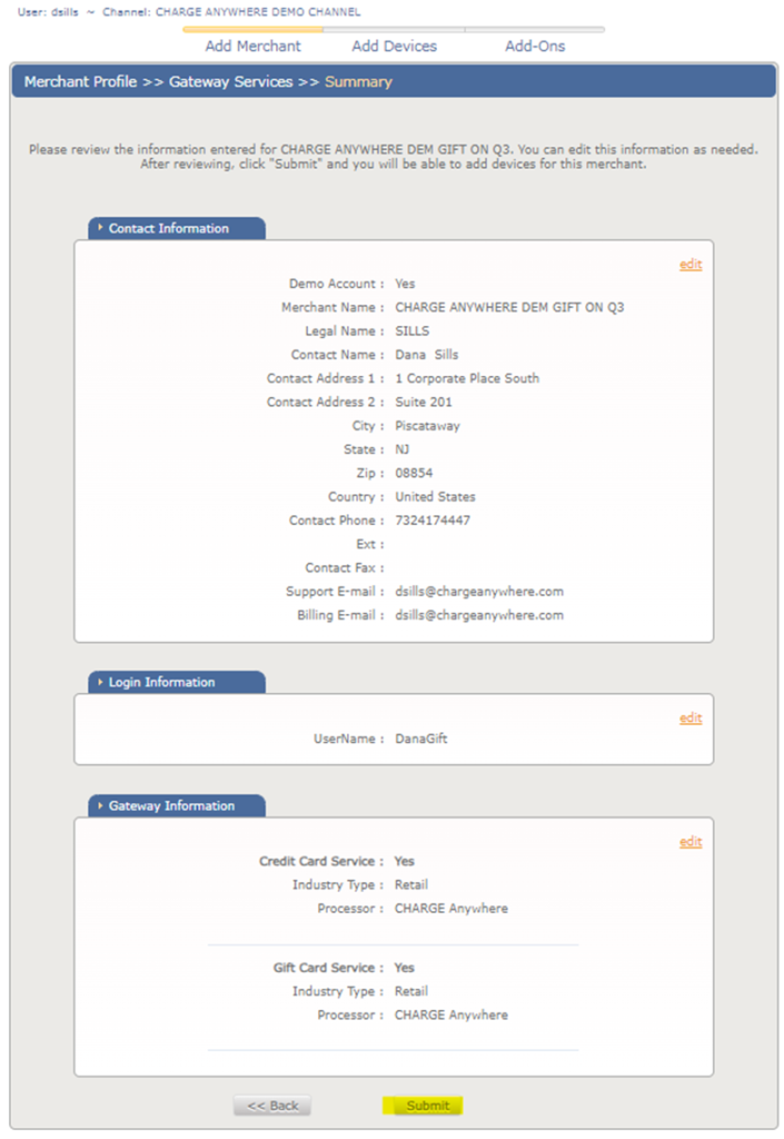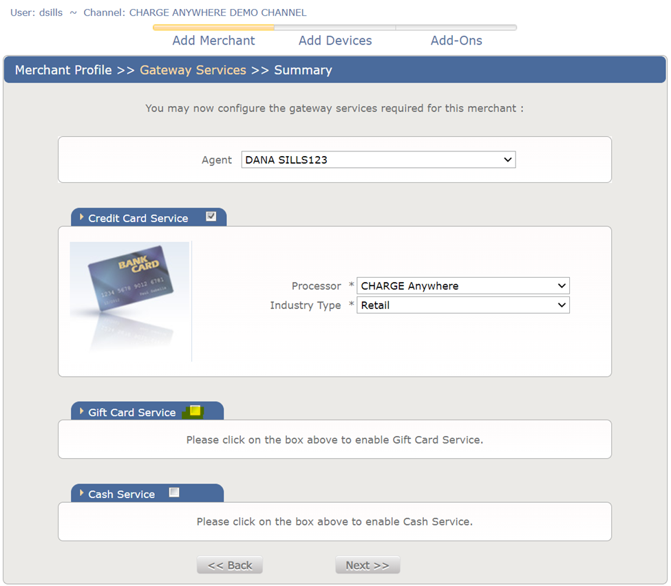3.1 When adding Gift to a New Merchant, once you complete the Merchant Profile, under Gateway Services, check the box to the right of Gift Card Service.  This enables the service at the merchant level.