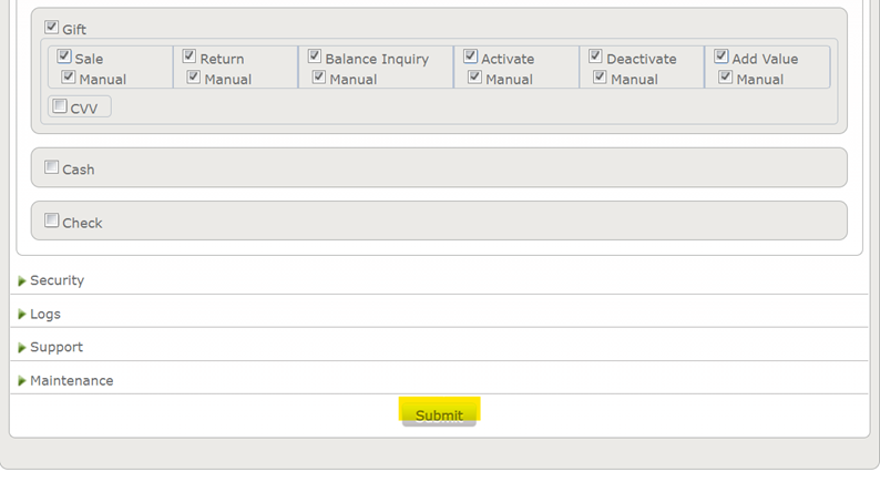 4.11 Once all are selected, click on Submit at the bottom of the screen and your terminal is ready to accept gift.