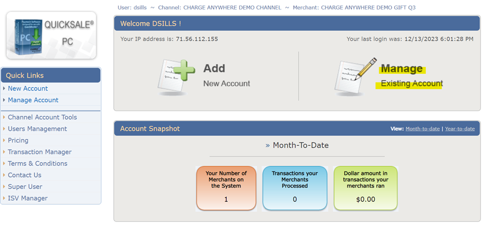 4.1 The service can also be added to an existing merchant and applied to an existing device using the same steps above by initially selecting Manage Existing Account from the Home Page.