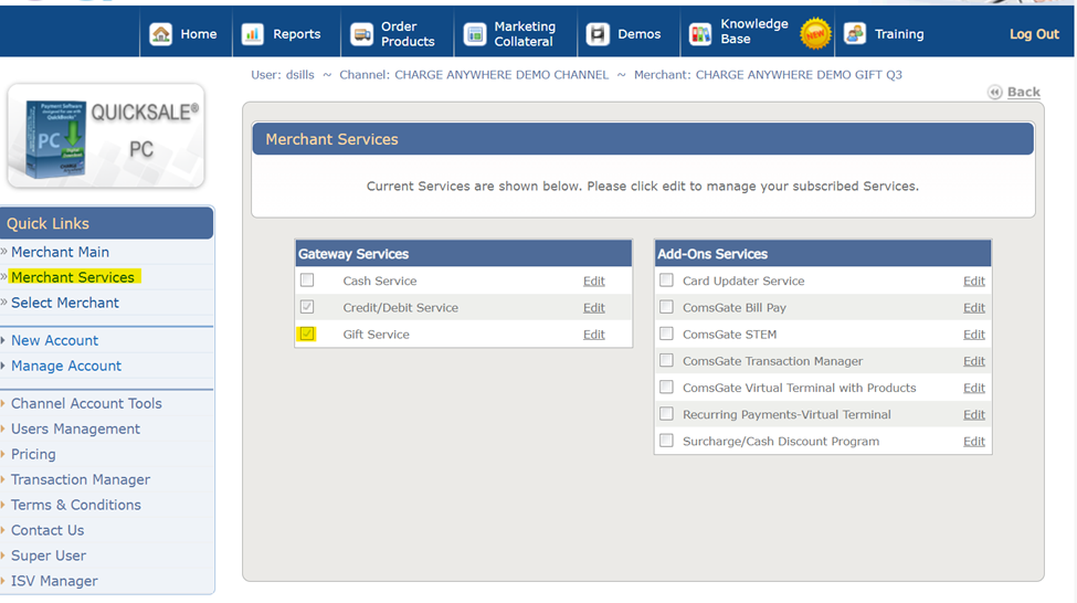 4.2 Select your merchant, then go to Merchant Services to enable Gift by checking the box next to Gift Service.