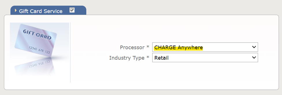 3.2 The Gift Card Services section will expand once the page refreshes from the above box being checked. For Processor, select CHARGE Anywhere. Then select the appropriate Industry Type based on the associated pull-down menu.