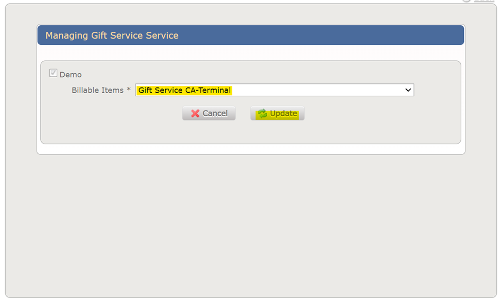 4.3 Then select Gift Service CA-Terminal to the right of Billable Items and select Update.