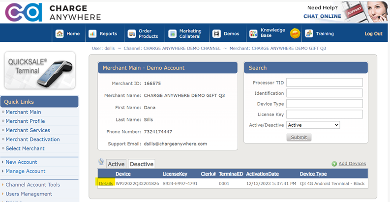 4.6 From the Merchant Main screen, for each activated device, click on Details.