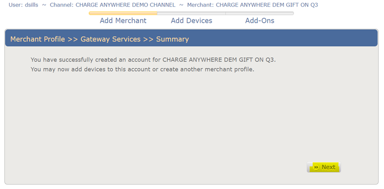 3.4 You will then receive a confirmation that the account was successfully created, and you may now add devices to this account. Click on Next.