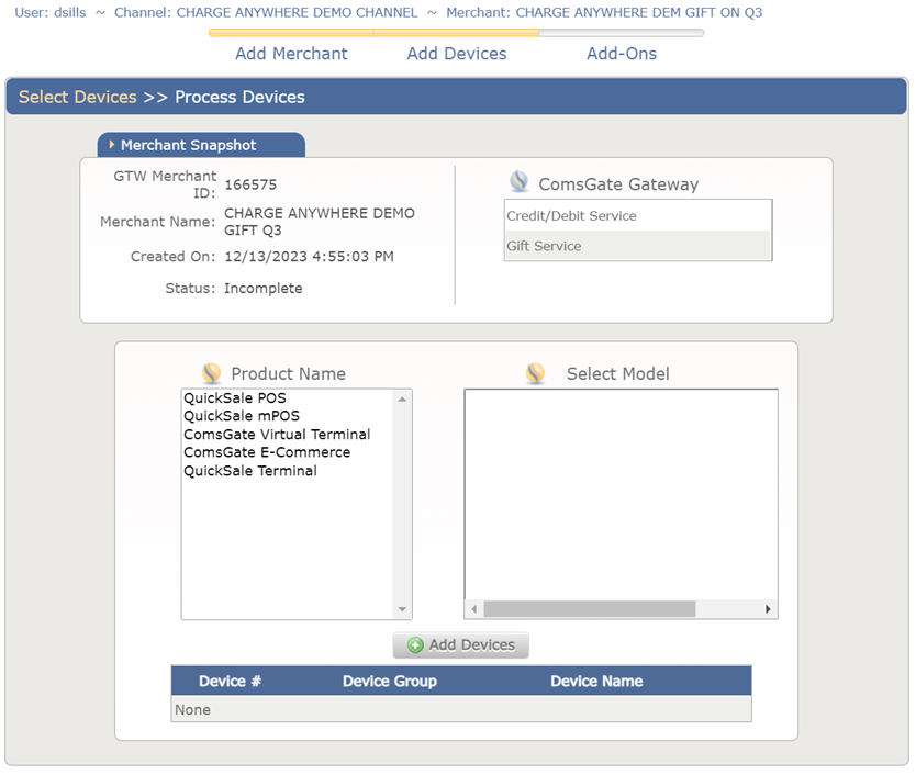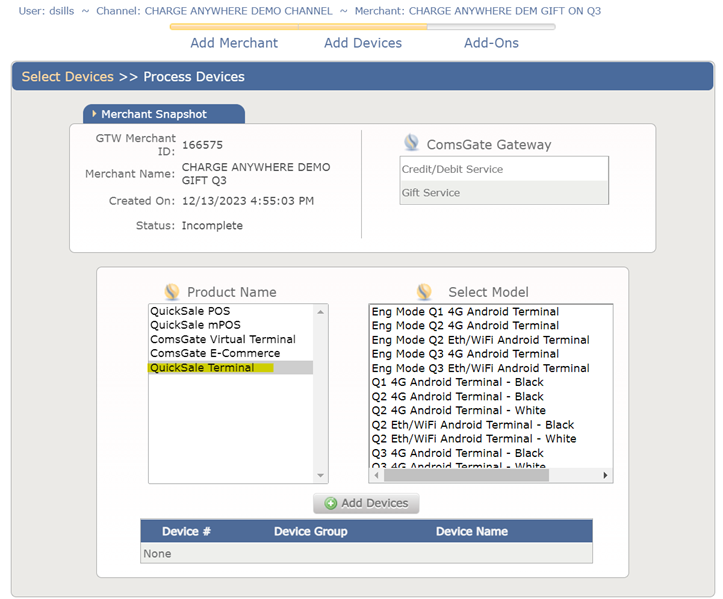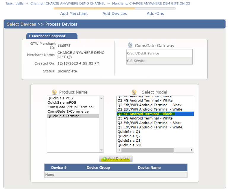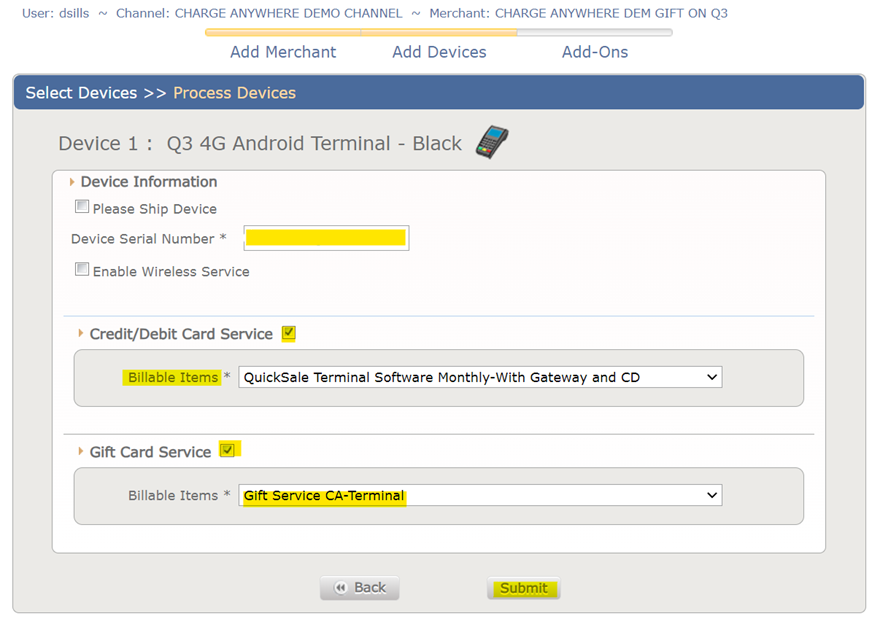 3.8 You will now see the Process Devices Screen. Enter the Serial Number, Check the Credit/Debit Card Service box, and select the appropriate Billable Item as well as the Gift Card Service box. Under Gift for the Billable Items select Gift Service CA-Terminal.
