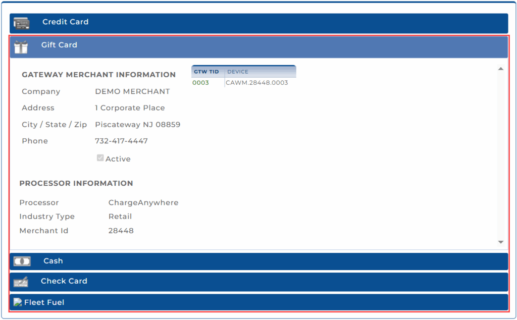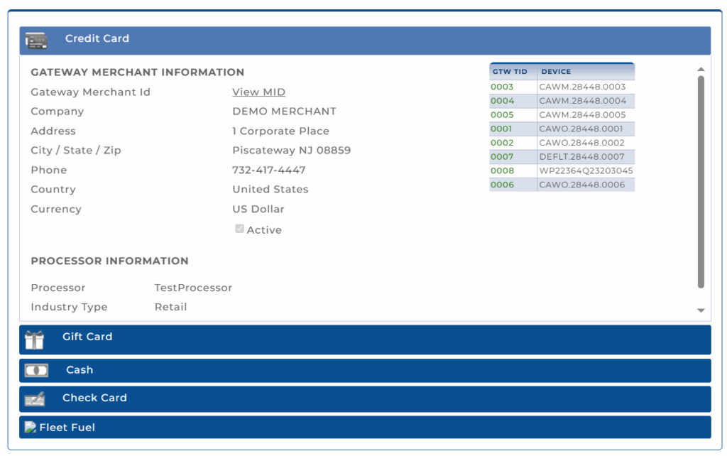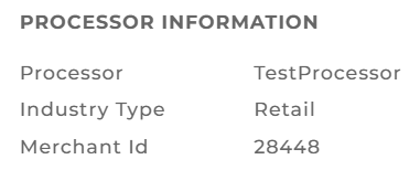 Displayed under the merchant profile, this section outlines how the merchant is configured with the payment processor.