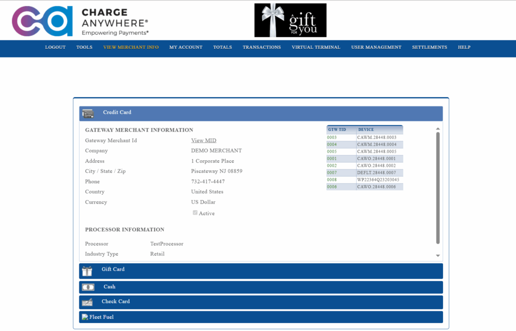 The View Merchant Info option in Charge Anywhere’s Transaction Manager provides merchants with a centralized summary of their account profile. This includes business information, processor setup, device configurations, and additional supported payment types such as Gift Card, Cash, Check, etc. It helps merchants validate account status, identify terminal devices, and retrieve integration credentials like the Merchant ID (MID).