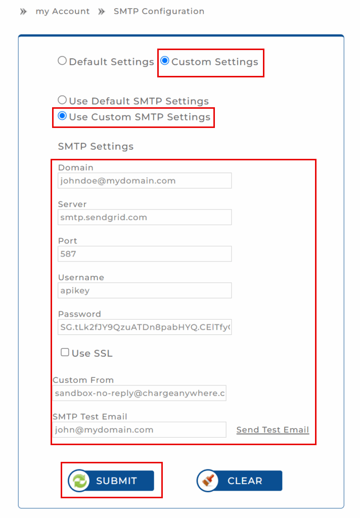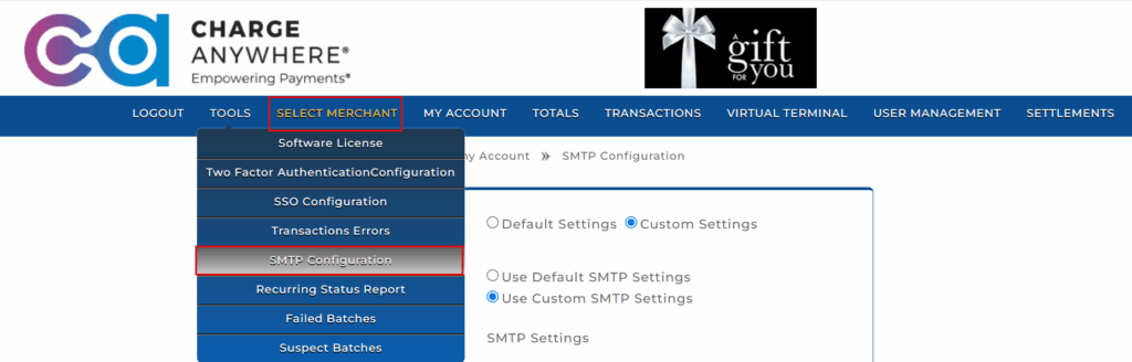 Default SettingsUses the built-in Charge Anywhere SMTP server settings. No additional configuration needed.