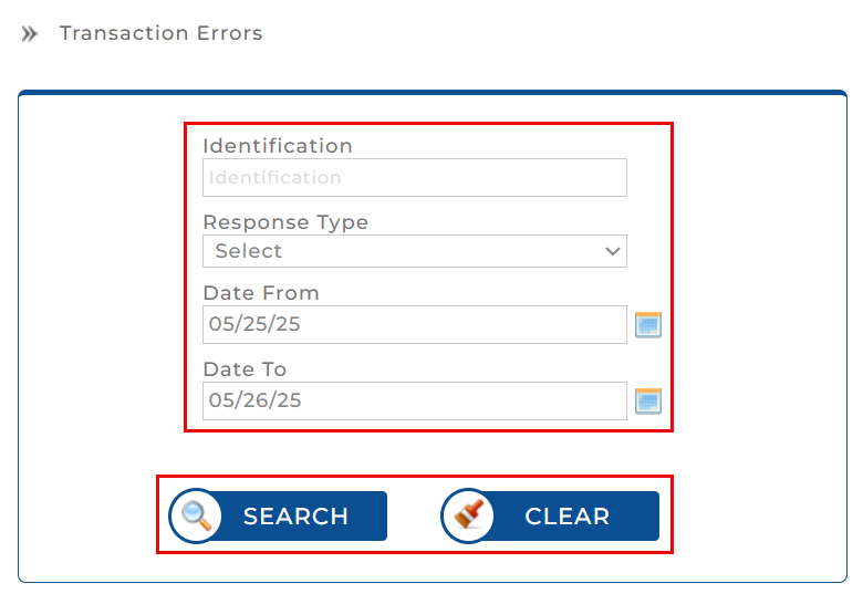 At the top of the Transaction Errors screen, you can apply filters to narrow down your search: