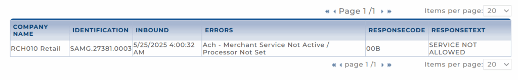 | Errors | Description of the error (e.g., Merchant Service Not Active / Processor Not Set). |